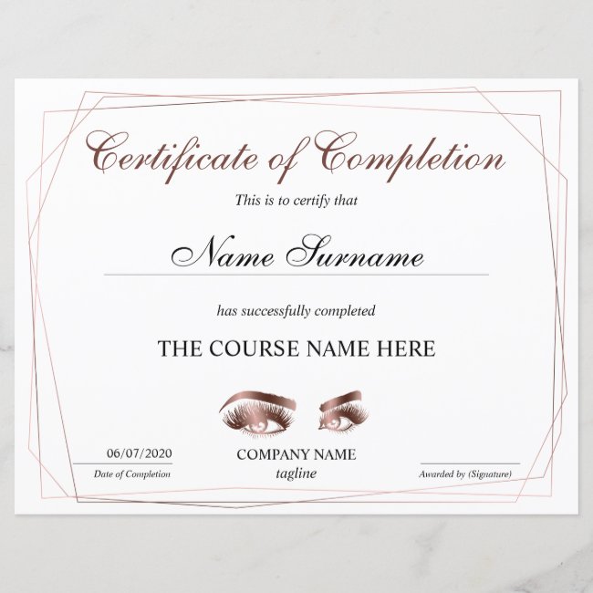 Certificate of Completion Award lashes Course